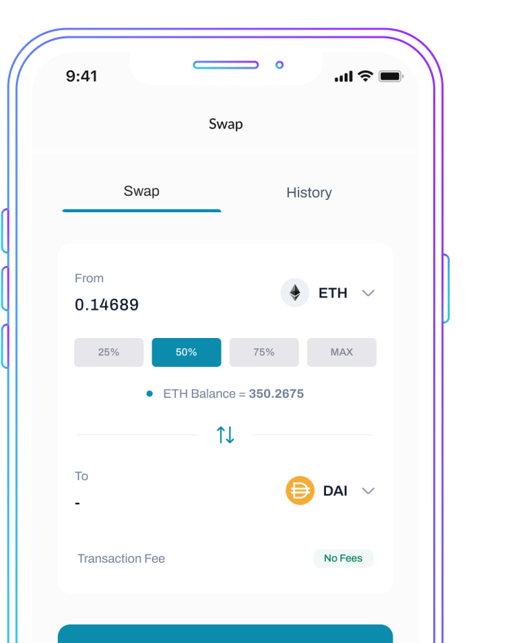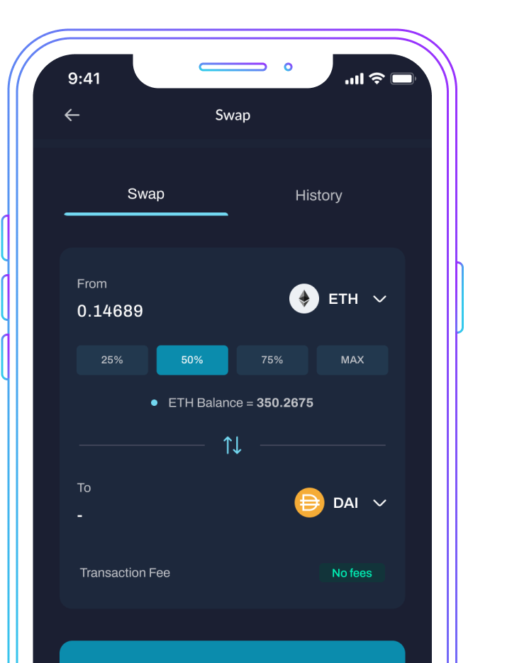 Click on the Swap button. Select the crypto you want to swap. Enter the amount you would like to swap. And done! Your crypto has been swapped successfully. Happens in seconds.